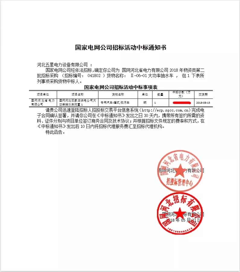 國家電網公司經依法招標,確定河北五星公司為國網河北省電力有限公司“”2018 年物資類第二批招標采購 (招標編號: 041802 )”項目中,河北五星研制生產的“大流量應急搶險排澇車”一舉中標!!